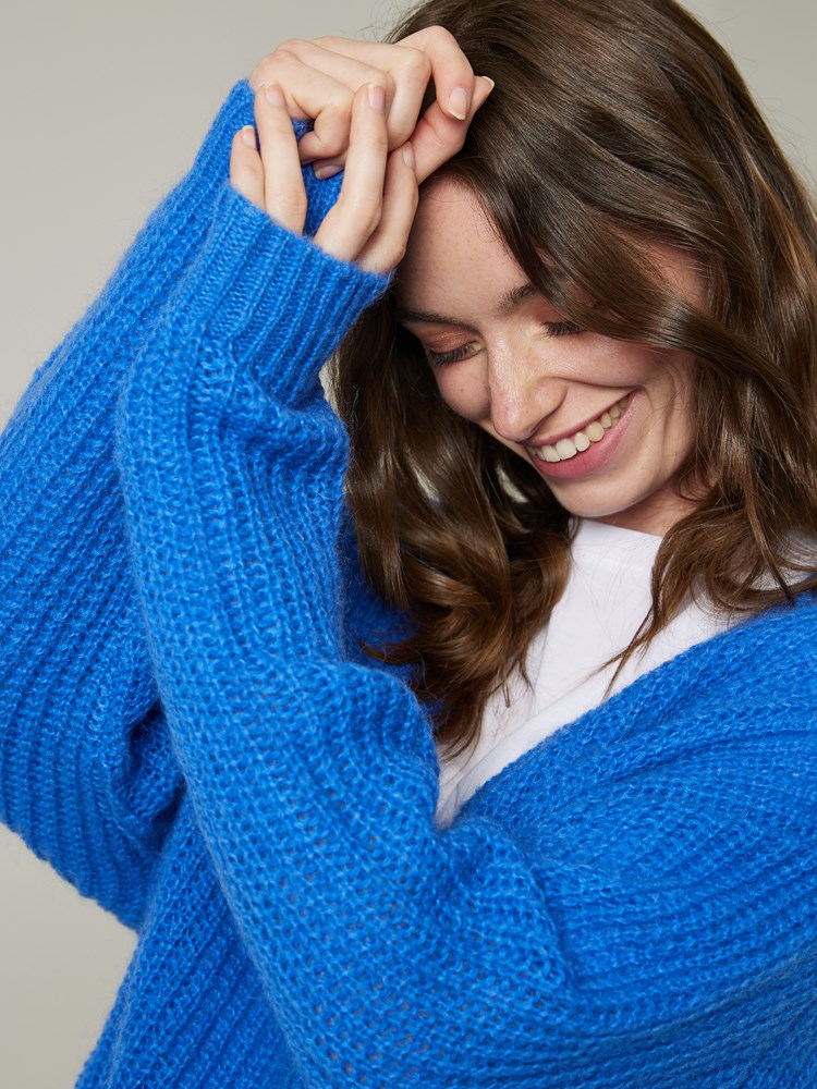 Ribbestrikket cardigan i myk ullblanding. Cardiganen har hornfargede knapper i front, senkede skuldersømmer og en liten logobadge i metall nede på siden. Modellen er 176 cm høy og bruker str S.