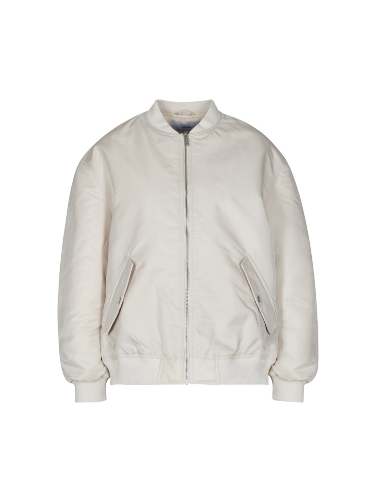 Lett oversized jakke i bombermodell. Jakken har ribkanter, dekorsøm med rynkeeffekt på rygg og ermene, klaffelommer og er litt lenger bak en foran.