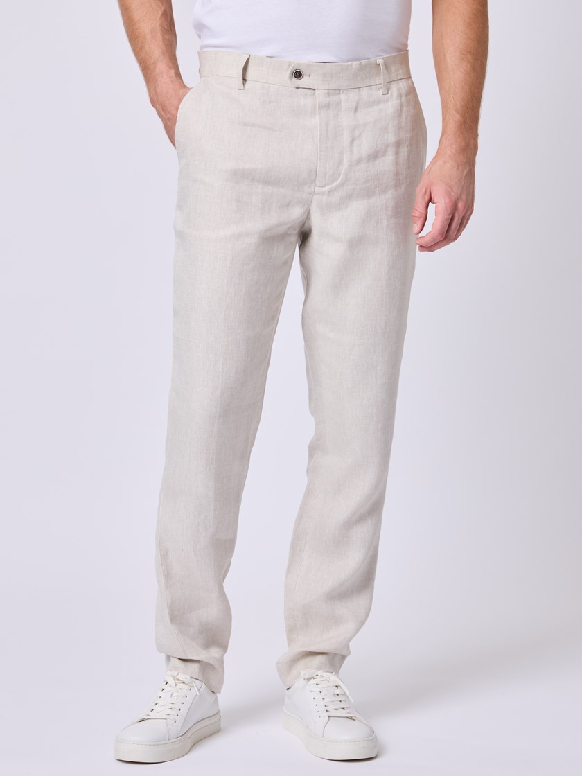 Klassisk bukse med chinosdetaljer i to tonet lin med god passform og rette ben. Buksen har stikklommer i siden, passepoilerte baklommer, normal livhøyde, glidelåsgylf i front og lukkes med hekte og knapp i livet. Kjøp gjerne med Roswell linblazer for komplett sett