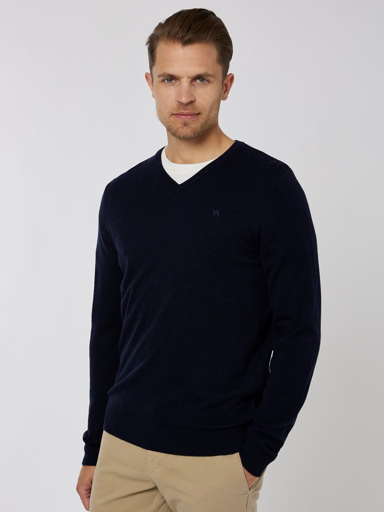 Finstrikket genser i myk ullblanding med v -hals og innvendig kontraststrikk i nakken. Genseren har strikkede albuelapper i kontrastfarge, ett lite logobroderi i kontrastfarge på brystet og ribbestrikkede vrangborder. Klassisk passform.