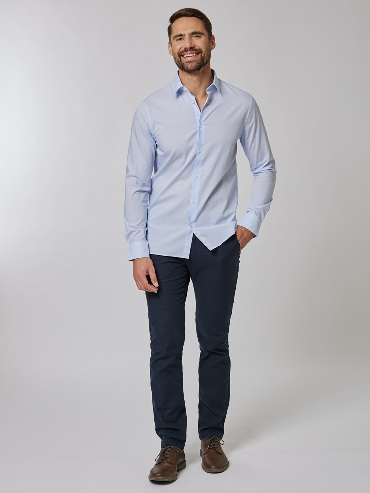 Pinstriped poplinskjorte i bomull med god stretch. Skjorten har enkel knappestolpe, lyse knapper, regulerbar mansjett og krage med permanent krage-avstiver. Skjorten har innsnitt i ryggen, og slimfit passform. Denne skjorten har Vesbars smaleste passform. Modellen er 184cm og har på seg str M.