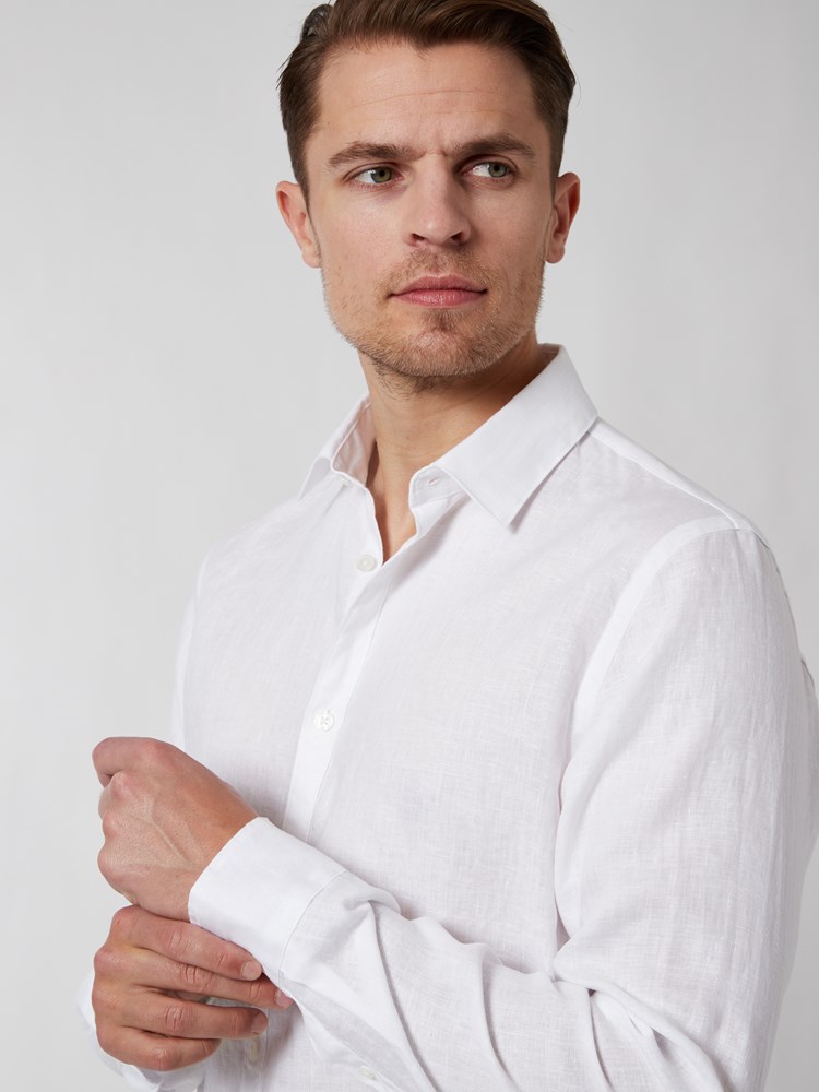 Langermet skjorte i myk lin og bomullskvalitet. Skjorten har regulær passform, sydd knappestolpe med lyse knapper, bærestykke bak og en liten kontrast tape i nakken. Sjkorten kommer i tre varianter, en hvit, en melert og en stripet.