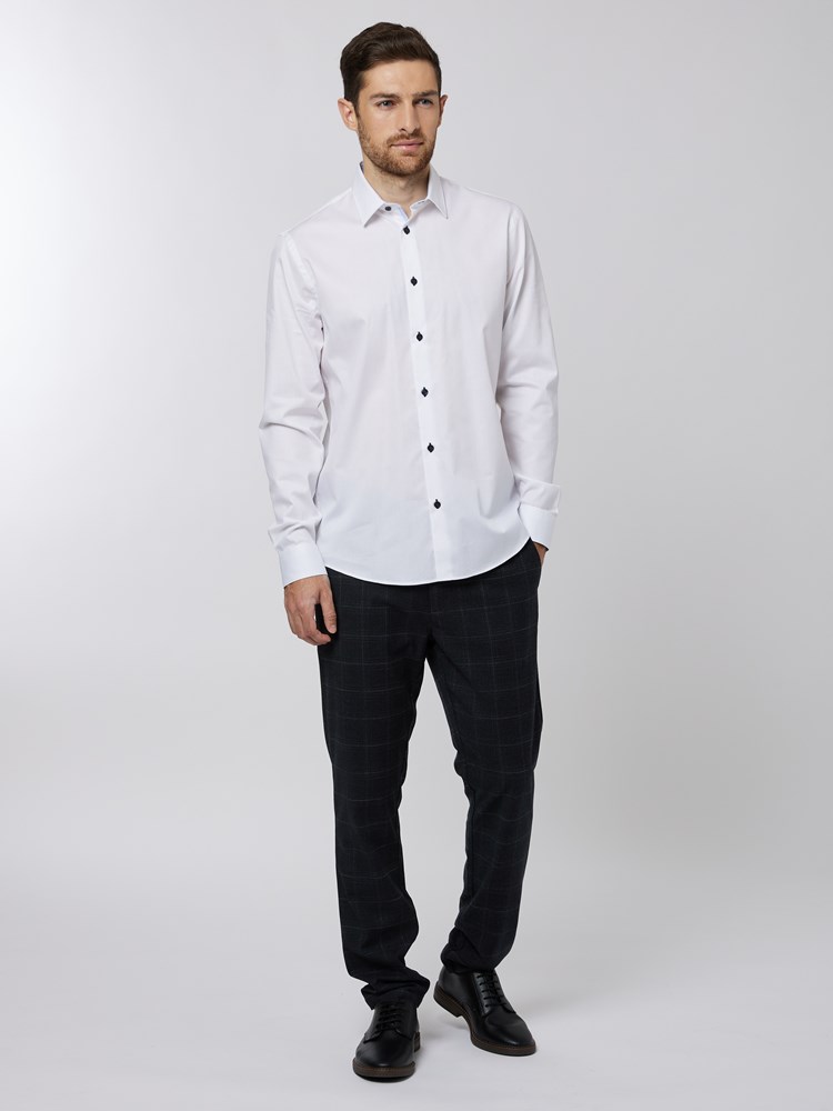 Klassisk skjorte i lett strukturvevet easycare-behandlet bomull. Skjorten har enkel knappestolpe, normal krage med innsydd krageavstiver og innvendig kontrast, lyse logoknapper med mørk knappetråd, fitted passform og regulerbar mansjett med dekorbånd innvendig.