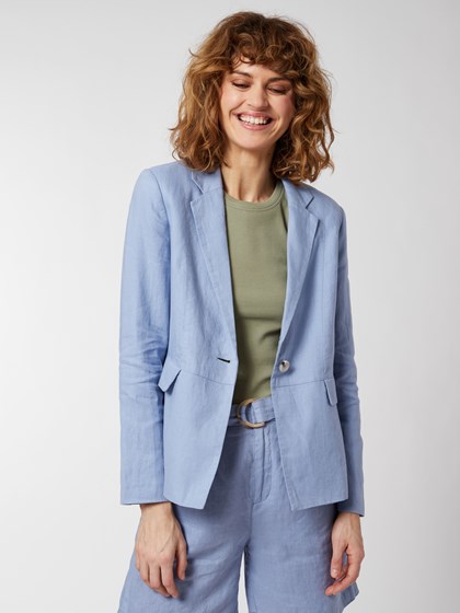 Blazer i behagelig lin med fôr og skulder-innlegg. Blazeren er delt i diskrete paneler, har lommer med avrundede klaffer og lukkes med en knapp. Feminin passform. Kjøpes gjerne med Clarita linshorts for matchende sett.