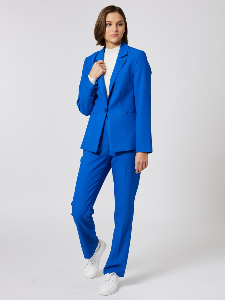 Tidsriktig blazer i behagelig kvalitet med god stretch og feminin passform. Blazeren har passepoilerte lommer, knapper på ermet, ton i ton fôr, og lukkes i front med en knapp. Kjøp gjerne Colour bukse for komplett dress.