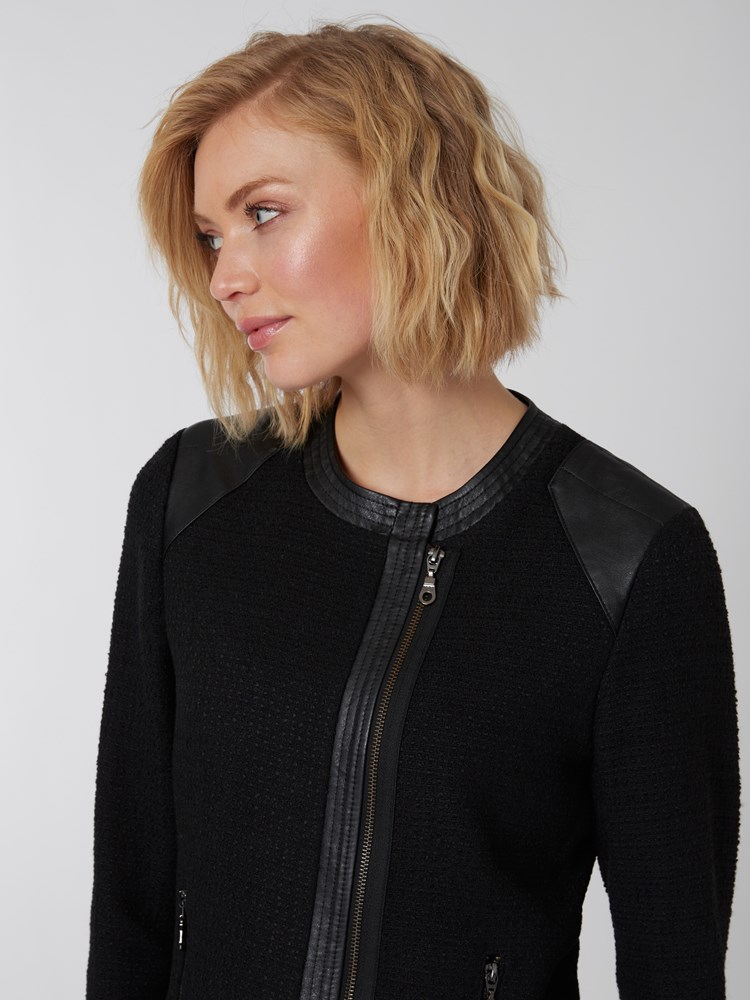 Klassisk jakke i lett strukturert bouclè kvalitet med matchende fôr. Jakken har detaljer i skinnimitasjon, glidelåslukning i front, feminin passform og to glidelåslommer i front.