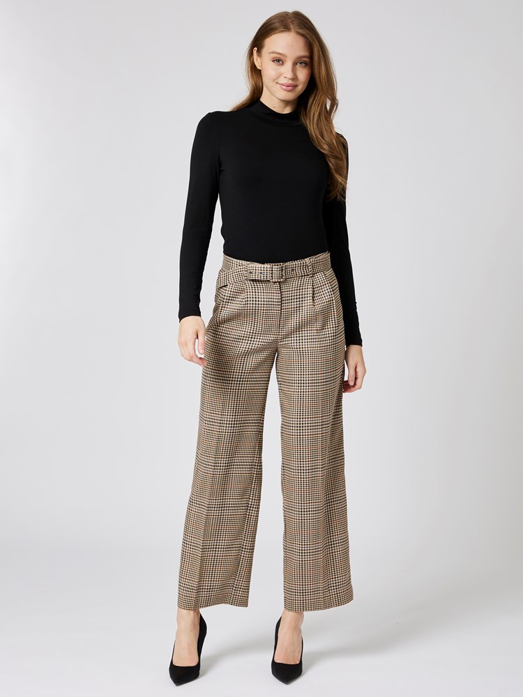 Komfortabel rutet dressbukse i behagelig kvalitet med mid waist liv, stikklommer i siden, passepoilerte baklommer med knapp og linning med beltestropper og matchende belte med spenne. Buksen har vide rett ben og lukkes i livet med knapp og glidelås. Kjøp gjerne sammen med Archie blazer og Archie vest for matchende sett. Modellen er 180cm og har på seg str 36.