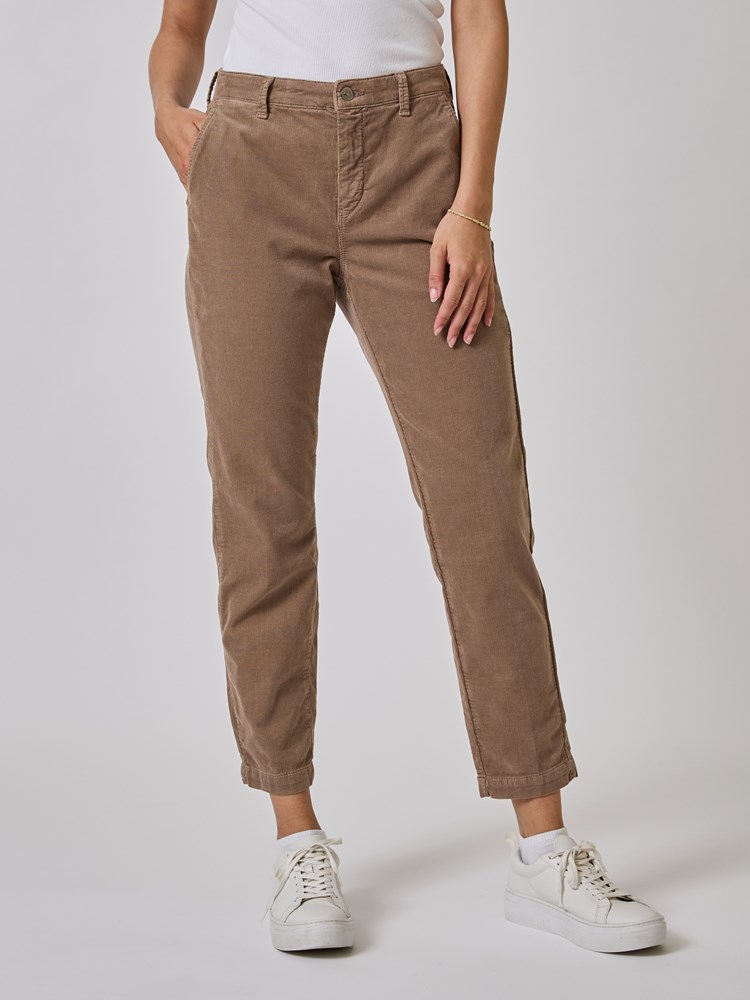 Chinos i myk babycord med klassiske chinos detaljer og cropped benlengde. Buksen har normal livhøyde, stikklommer foran og passepoilerte fuskelommer bak. Modellen er 175cm og har på seg str 3628.