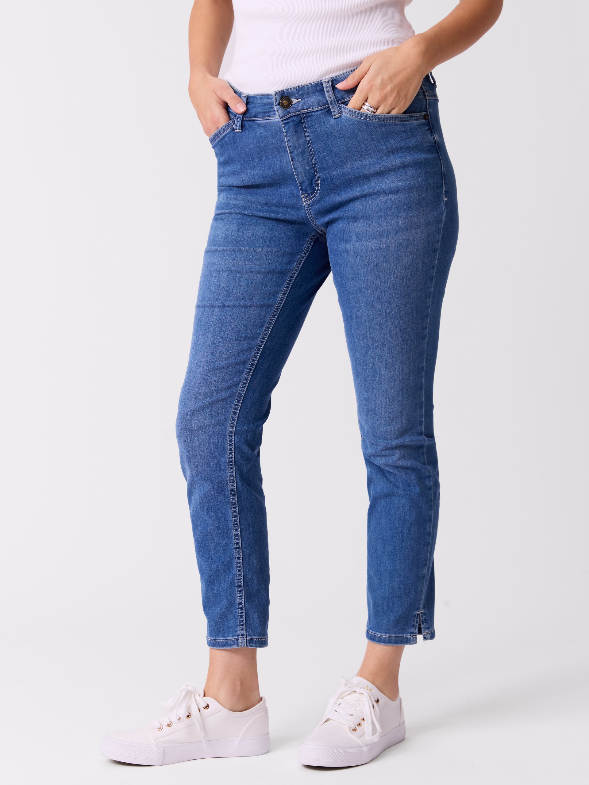 Slim fit 5 pocket jeans med smale ben med liten splitt nede og normal livhøyde med komfortabel linning med stretch.