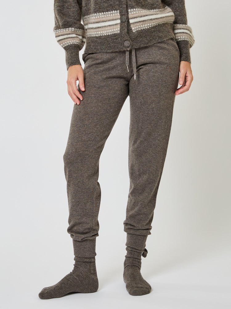 Strikket bukse i myk ull og bomullsblanding. Buksen har elastikk og snøring i livet, rib nederst i beina og mid waist livhøyde. God passform. Modellen er 175cm og har på seg str S.