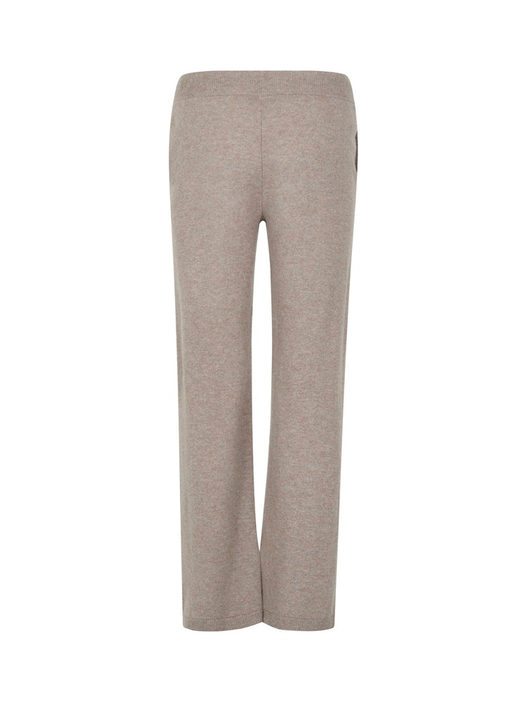 Eksklusiv finstrikket bukse i myk 100% kasjmir. Buksen har rette ben med en liten ribbestrikket vrangbord nederst, behagelig elastikk og snøring i livet, stikklommer og mid high waist. Modellen er 176cm og har på seg str S.