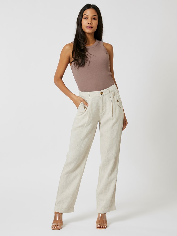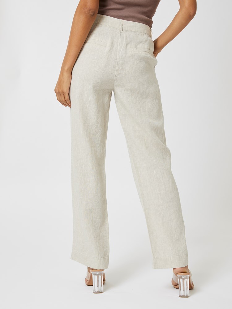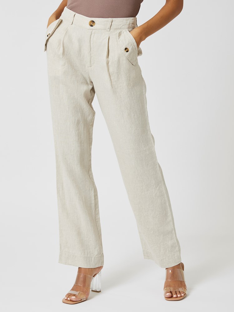 Ledig linbukse med mid waist livhøyde med beltestropper, stikklommer med klaff og naturfarget knapp, passepoilerte fuskelommer bak og lukning med glidelås og knapp i livet. Buksen har rette ben. Modellene er 175cm og 176cm og har på seg str 36.