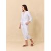 Komfortabel linbukse med legg og stikninger på linningen i front, elastikk i livet bak, stikklommer i siden og vide ben som smalner inn nede og har elastikk bak på beinet. Normal livhøyde og lengde ca til leggen.