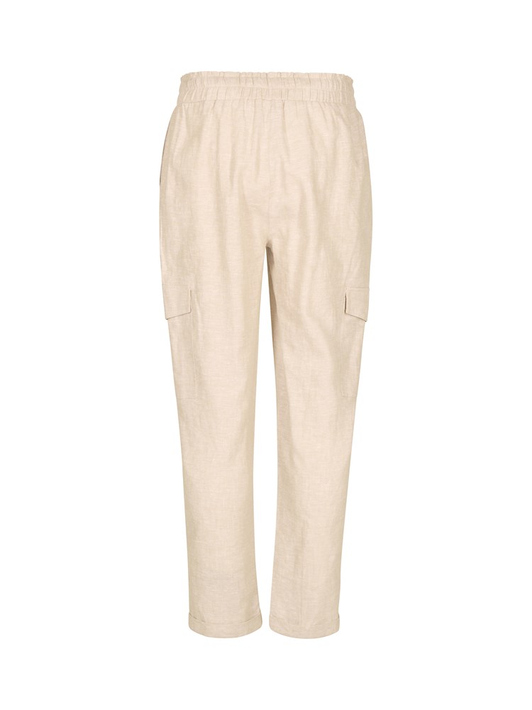 Behagelig cargobukse i linblanding med høyt liv og elastikk med snøring i livet. Buksen har stikklommer, cargolommer med klaff på lårene og ledig passform med rette ben og liten oppbrett nederst. Modellen er 175cm og har på seg str 36.