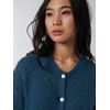 Feminin cardigan med perlemorsfargede knapper, rund hals og ribbestrikkede vrangborder. Strikkejakken er i myk ullblanding og har ledig passform. Liten metallbadge på venstre side nederst. Modellen er 170 cm høy og bruker str S.
