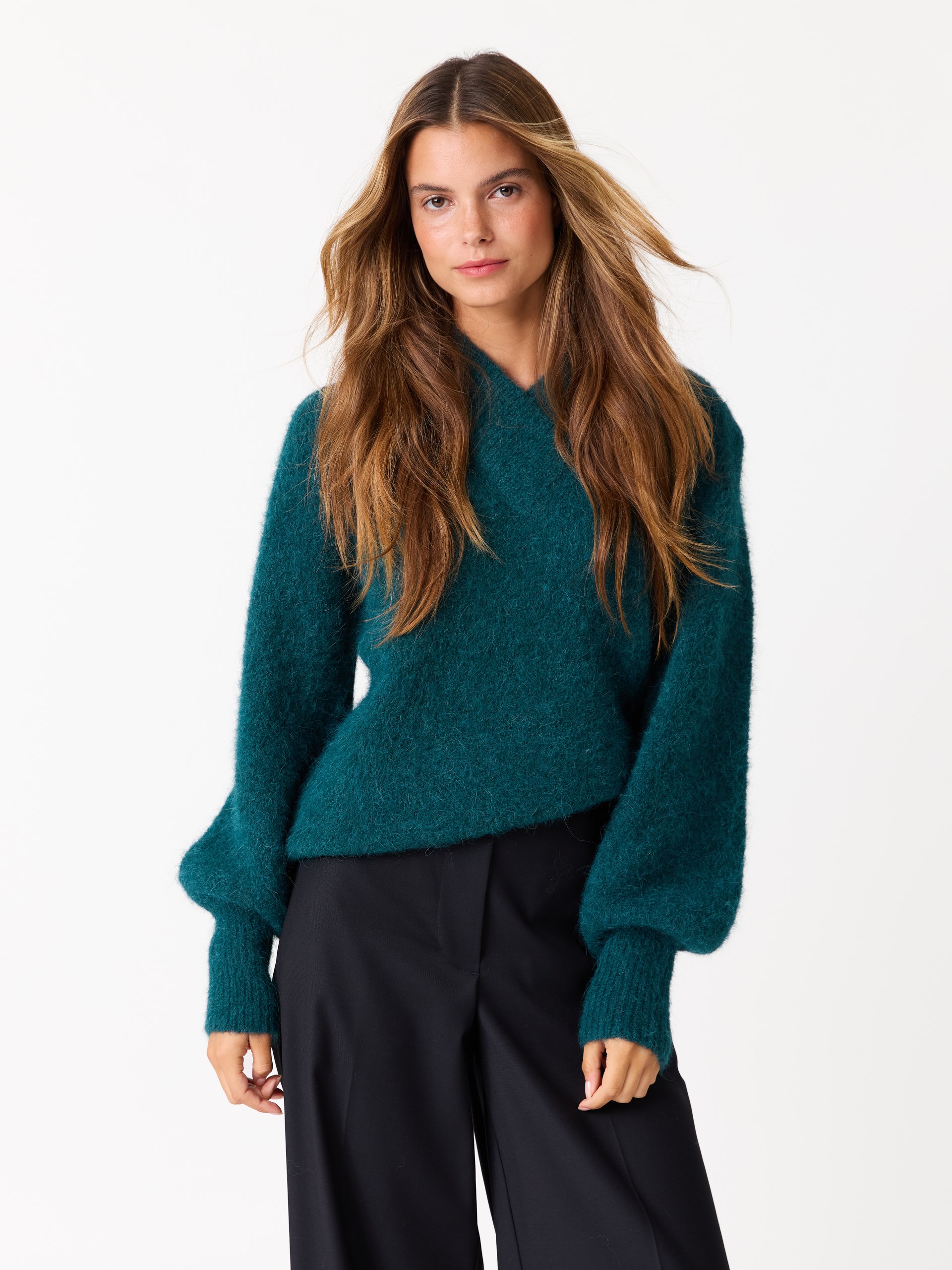 Delikat strikkegenser med overlappende v utringing og bred vrangbord