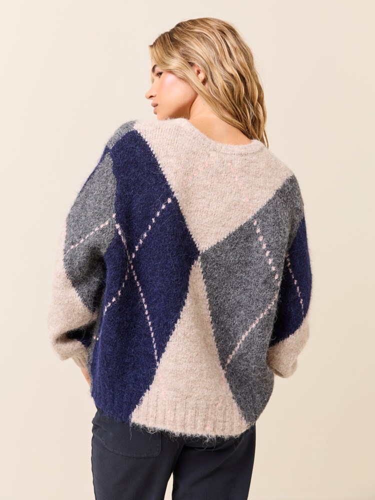 Strikket genser i lett oversized passform med delikat argylemønster og ribbestrikkede vrangborder. Genseren er strikket i en eksklusiv chunky ullblanding og har en liten logobadge i metall nede på siden. Modellen er 170 cm høy og har på seg str S.