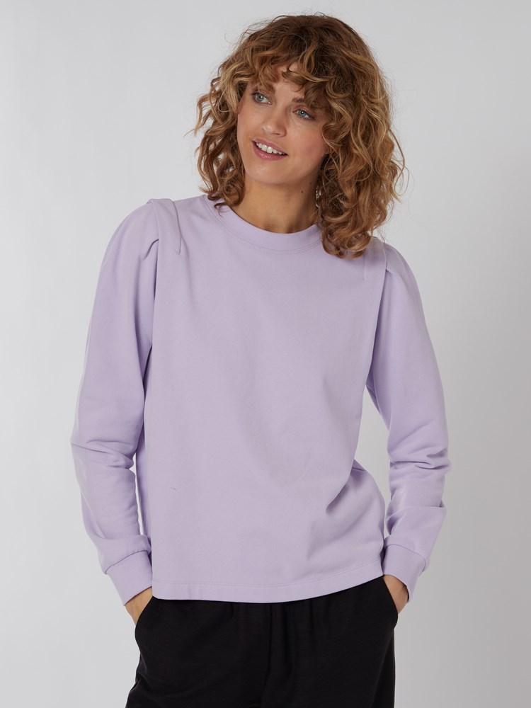 Feminin genser i myk jersey med rund hals, sømdetalj foran og bak på skulderparti, og lange puffermer. Genseren har ribkanter rundt halsen og på ermet, og ledig passform.