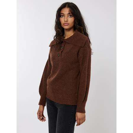 Strikket genser i myk melert ullblandet kvalitet med ribbestrikkede vrangborder. Genseren har en generøs krage og ribbestrikket bærestykke med 3 knapper. Ledig kvalitet.