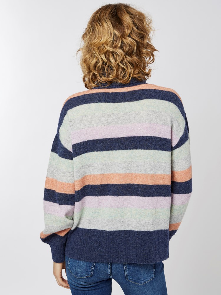 Lekker genser strikket i myk ullblanding. Genseren har delikate blokkstriper og generøs høy hals. Ledig passform med senket skulder og ribbestrikkede vrangborder.