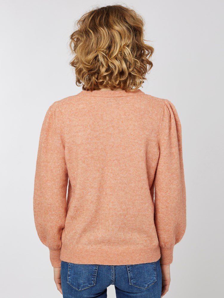 Genser i delikat melert ullblanding med lang ballongerm med puff og høy ribbestrikket mansjett. Genseren har rund hals og ledig passform.