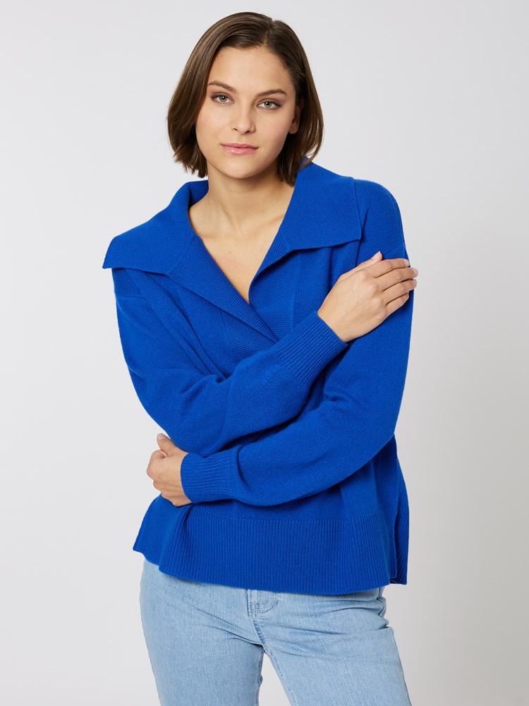 Finstrikket genser i 100% myk merinoull. Genseren har krage og overlappende v hals, ribbestrikkede vrangborder og ledig passform med senkede skuldersømmer. Splitter i siden. Modellen er 175cm høy og har på seg størrelse S.