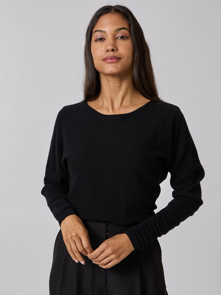 Genser i lekker melert ullblanding med rundet båthals og flaggermus erm med rynket effekt nederst. Modellen er 175cm og har på seg str S.