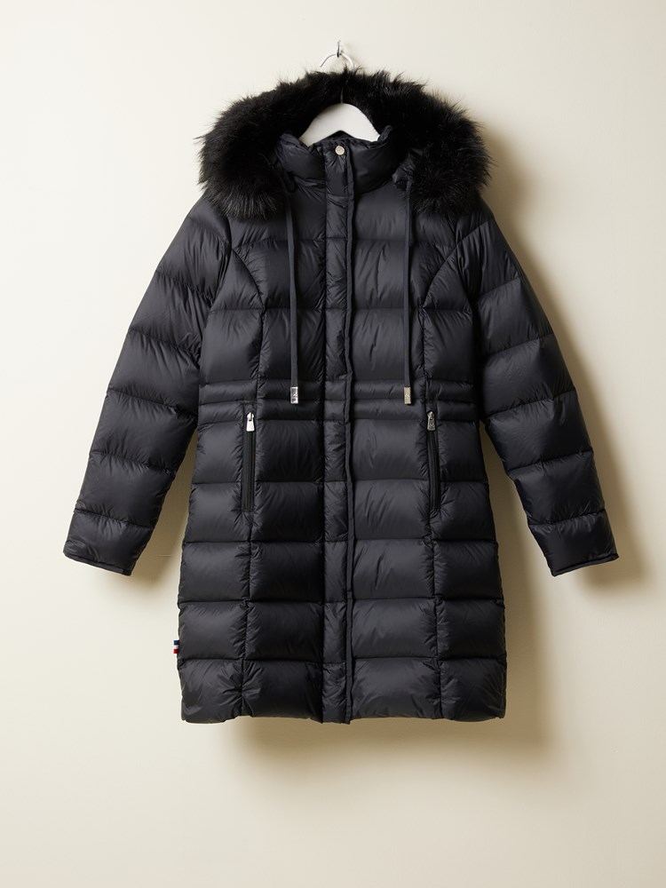 Varm og lett dunkåpe i den beste dunkvaliteten med ytterstoff i 100% resirkulert nylon, ton i ton fôr i 100% resirkulert polyester, feminin passform og avtagbar lekker fuskepels på hetten. Vinterjakken har god lengde, ton i ton fôr, fine detaljer og emaljert diskrè logobadge i metall på overerm. - Andedun: 90/10, dunspenst: 650 cuin