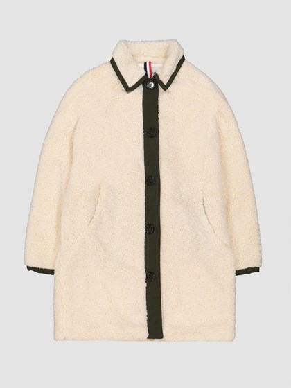 Pile kåpe i myk teddykvalitet med vevet kontraststoff langs knappestolpen, under kragen og på ermavslutning. Kåpen har naturfargede knapper, stikklommer, raglane erm og innvedig meshfôr. Innvedig tricolorefaret nakkehempe og liten metallbadge med logo på ermet. Modellen er 170 cm høy og bruker str S.