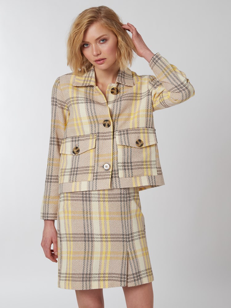 Elegant jakke i rutet myk kvalitet i viskose og bomull. Jakken har rett kort passform, mykt innlegg i skulder, krage og knappelukning, to lommer med klaff og knapp og delikat fôr innvendig. Rett avslutning nede. Kjøpes gjerne med Perle skjørt for matchende sett.