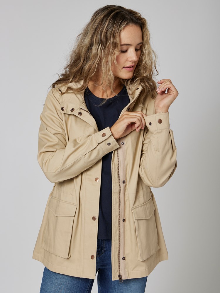 Komfortabel anvendelig jakke i bomullscanvas med matchende fôr. Jakken har hette med snøring, lavt bærestykke bak, en innerlomme med glidelås, innvendig snøring i livet store lommer med klaff og knapp i front, glidelås og logo trykknapper i front og regulerbar mansjett på ermet. Ledig passform. Modellen er 177cm høy og har på seg størrelse 36.
