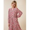 Kjole i viskose med delikat blomstermønster og lang erm med liten puff og knappet mansjett. Kjolen har v utringing med en liten rysjekant langs kanten, utskrådd skjørt, fôr i kroppen og lengde til under kneet. Liten metallbadge med logo nede på siden.
