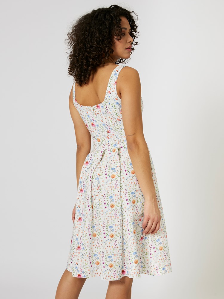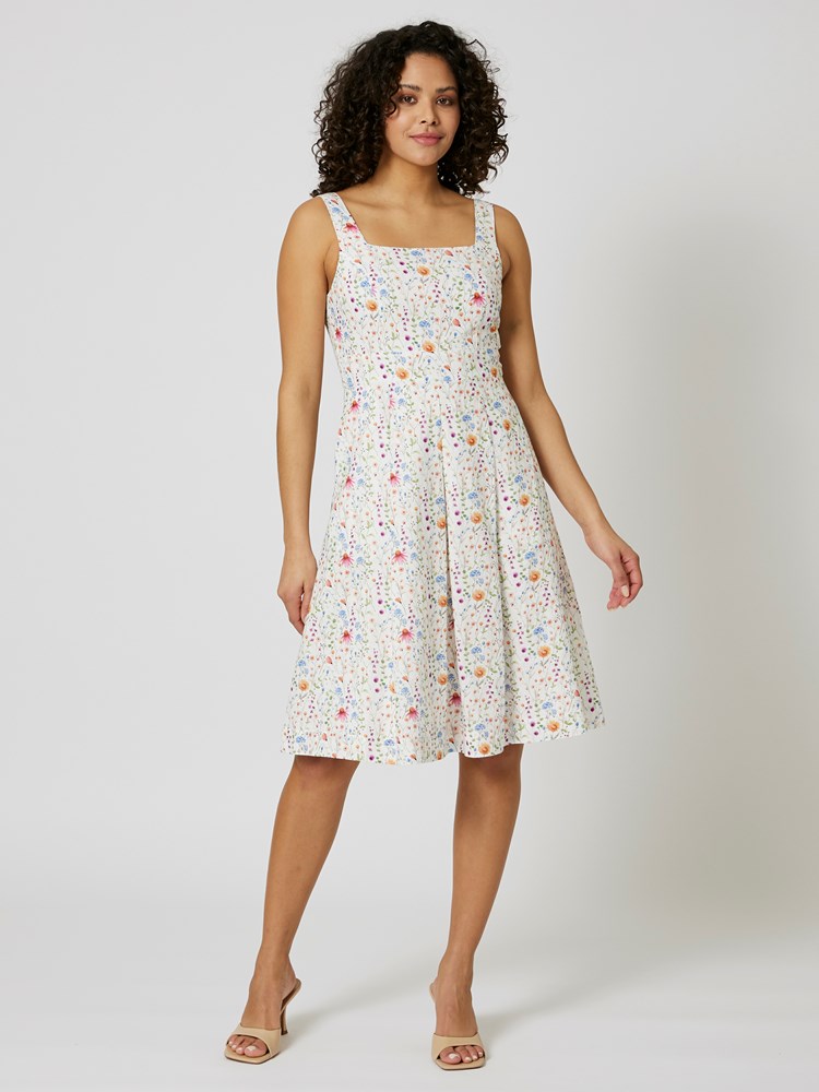 Kjole i myk lin og bomullsblanding med sommerlig mønster i delikate farger. Kjolen har firkantet utringing foran og bak, glidelås i ryggen, panelsøm i livet og nedsydde legg fra linningen. Skjørtet har god vidde, lommer i siden og lengde ca til kneet. Modellen er 175cm og har på seg str 36.