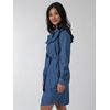 Feminin rett kjole i lett denim med frontknepping med naturfargede knapper ned til livet og løst knytebelte. Kjolen har bærestykke med volangkant, en liten logobadge i metall nede på siden og lang erm med knappet mansjett. Modellen er 170 cm høy og bruker str S.