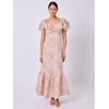 Delikat mønstret maxikjole i viskosechiffon med innvendig fôr, høy livskjæring, skulderstropp og volangerm med elastikk som kan brukes på eller av skulder. Kjolen har langt utskrådd skjørt med bred kappe som er foret med organza for rikelig volum.