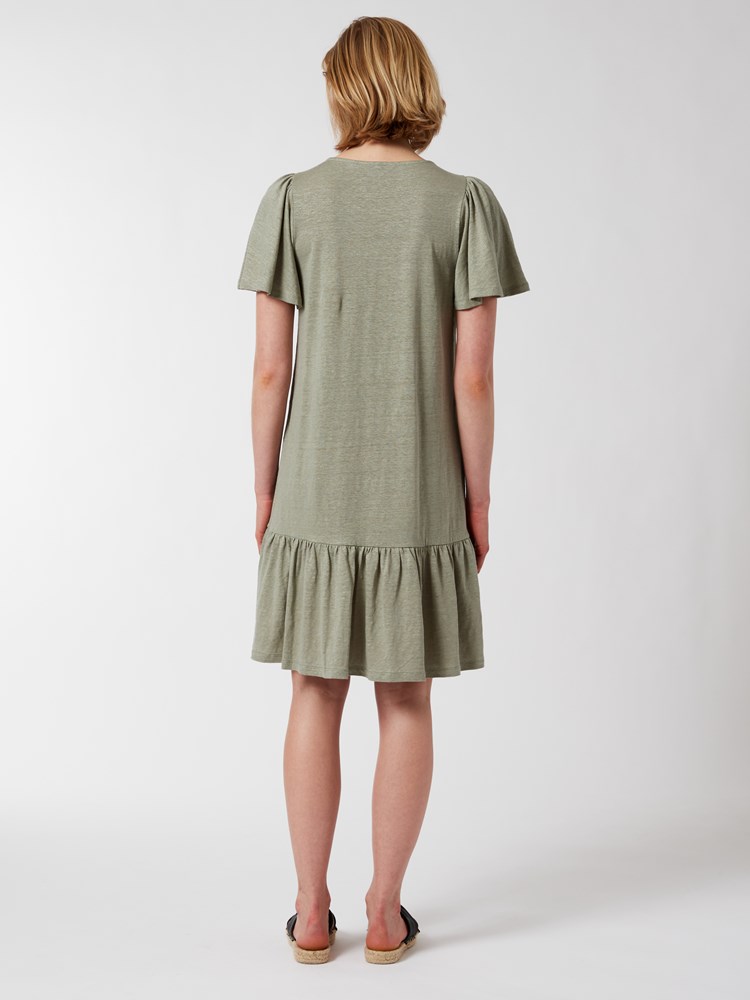 Linkjole i jersey med rundet halsåpning og flaggermusermer med rynker på skulderen. Kjolen har ledig passform og en høy kappe nederst. Lengde ca til rett under kneet.