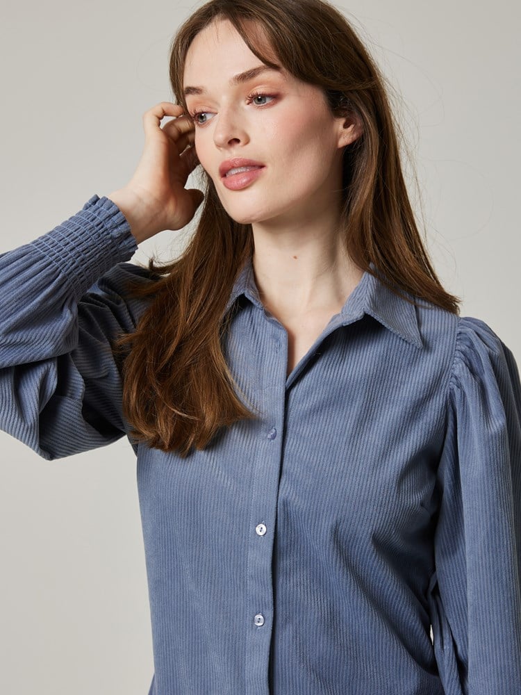Skjortekjole i myk cordkvalitet med krage og frontknepping, pufferm med ballong og elastikk nederst, samt innsnitt ved brystet. Kjolen har bred elastikk i livet bak og utskrådd skjørt. Normal passform. Modellen er 173 cm høy og bruker str S.