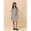 Stripet kjole i god og fast jerseykvalitet av bomull med elastan. Kjolen har rundet halsåpning, kort erm, søm i livet og lett innsvingt passform. Liten logobadge i metall nede på siden.