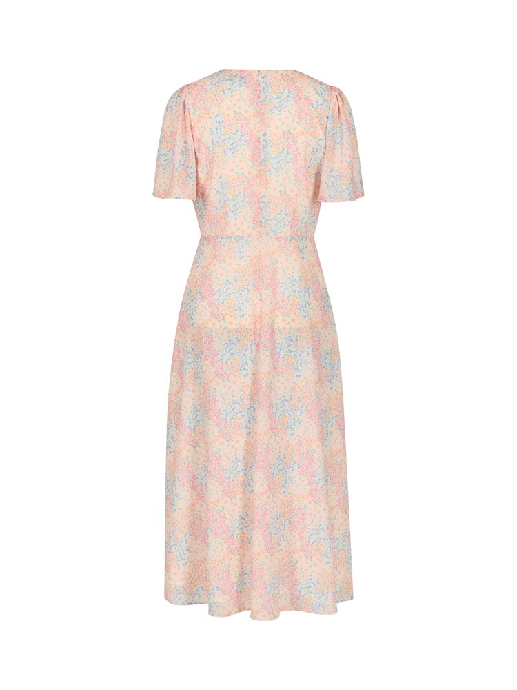 Delikat mønstret kjole i lett kvalitet med innvendig fôr, v utringing og høy skjæring i livet. Kjolen har glidelås i ryggen, stofftrukne knapper i front, kort volangerm og ankellang skjørt med vidde. Modellen er 175cm og har på deg str 36.