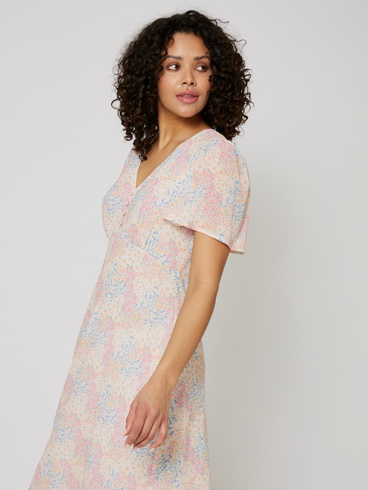 Delikat mønstret kjole i lett kvalitet med innvendig fôr, v utringing og høy skjæring i livet. Kjolen har glidelås i ryggen, stofftrukne knapper i front, kort volangerm og ankellang skjørt med vidde. Modellen er 175cm og har på deg str 36.