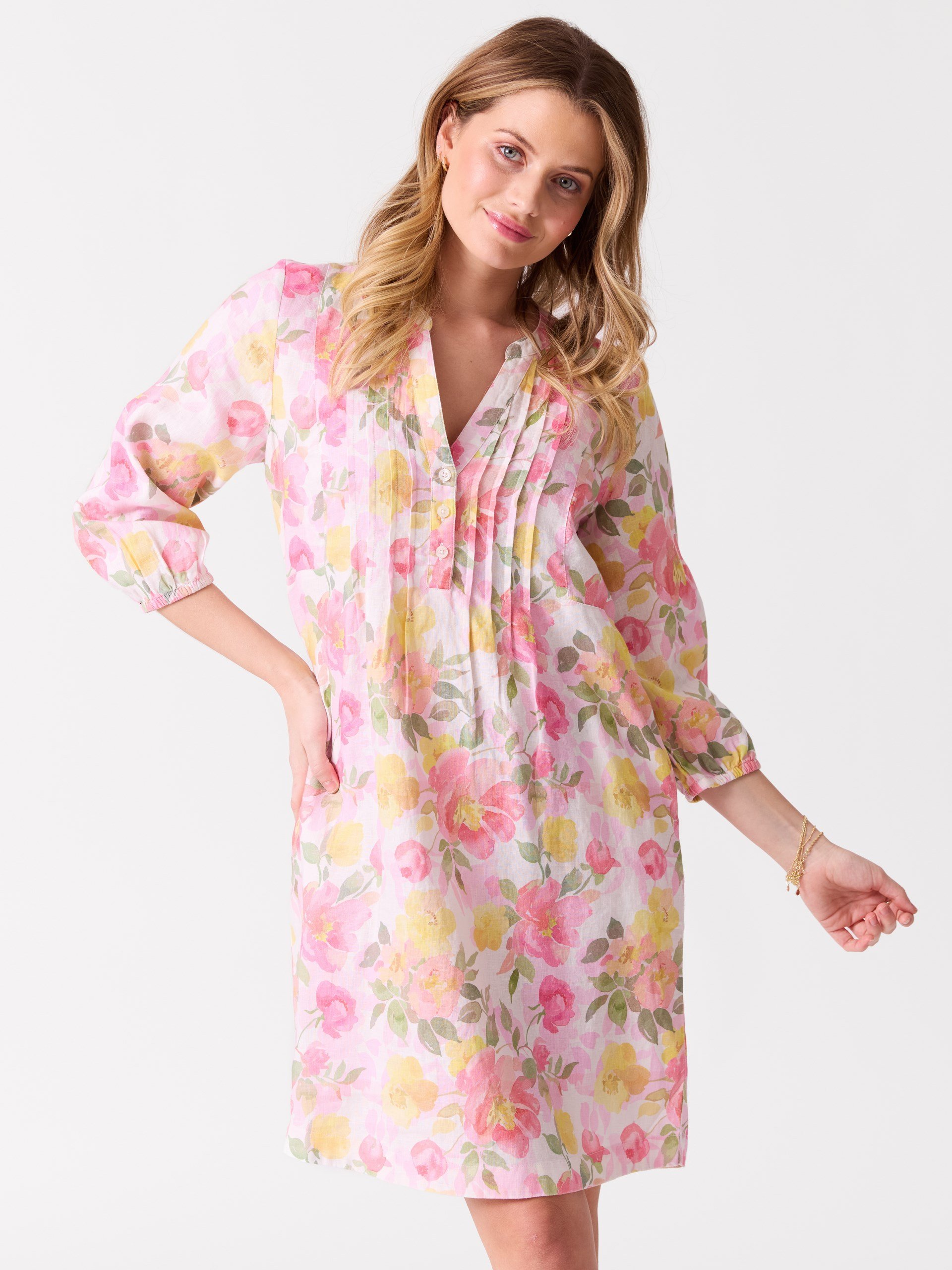 Mønstret linkjole med små legg på bærestykket foran.