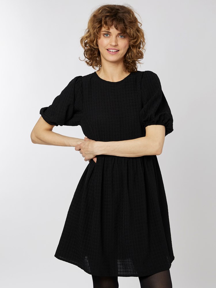 Kjole i kreppet kvalitet med rund hals og splitt med knapp i nakken. Kjolen har 3/4 lang pufferm med volum og elastikk nederst, søm i livet, stikklommer i siden og utskrådd skjørt med rynker og vidde. Lengde til rett ovenfor kneet.