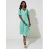 Kjole i småblomstret lett viskose med frontknepping og v utringing. Kjolen har kort volangerm, draperte sømdetaljer på skulderen, høyt skåret liv, elastikk i livet bak og innvendig lett fôr. Lengde til under kneet. Modellen er 177 cm høy og har på seg str S.