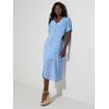 Kjole i småblomstret lett viskose med frontknepping og v utringing. Kjolen har kort volangerm, draperte sømdetaljer på skulderen, høyt skåret liv, elastikk i livet bak og innvendig lett fôr. Lengde til under kneet. Modellen er 177 cm høy og har på seg str S.