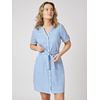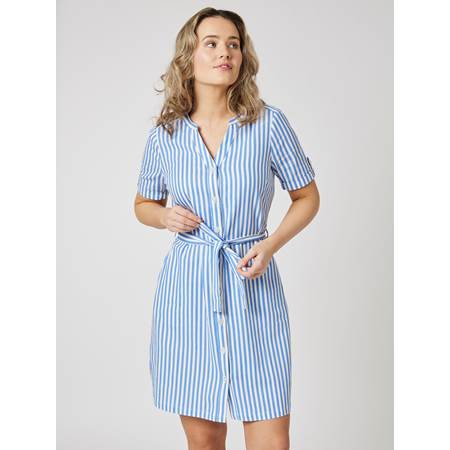 Skjortekjole med frontknapping, kort erm med oppbrett og knapp, knytebelte i livet og gode lommer i sidene. Kjolen har bærestykke med fold i ryggen, ledig passform og lengde ca til ovenfor kneet. NB! denne kjolen kommer med både striper, mønster og i ensfargede varianter. Modellen er 177 cm høy og har på seg størrelse 36.