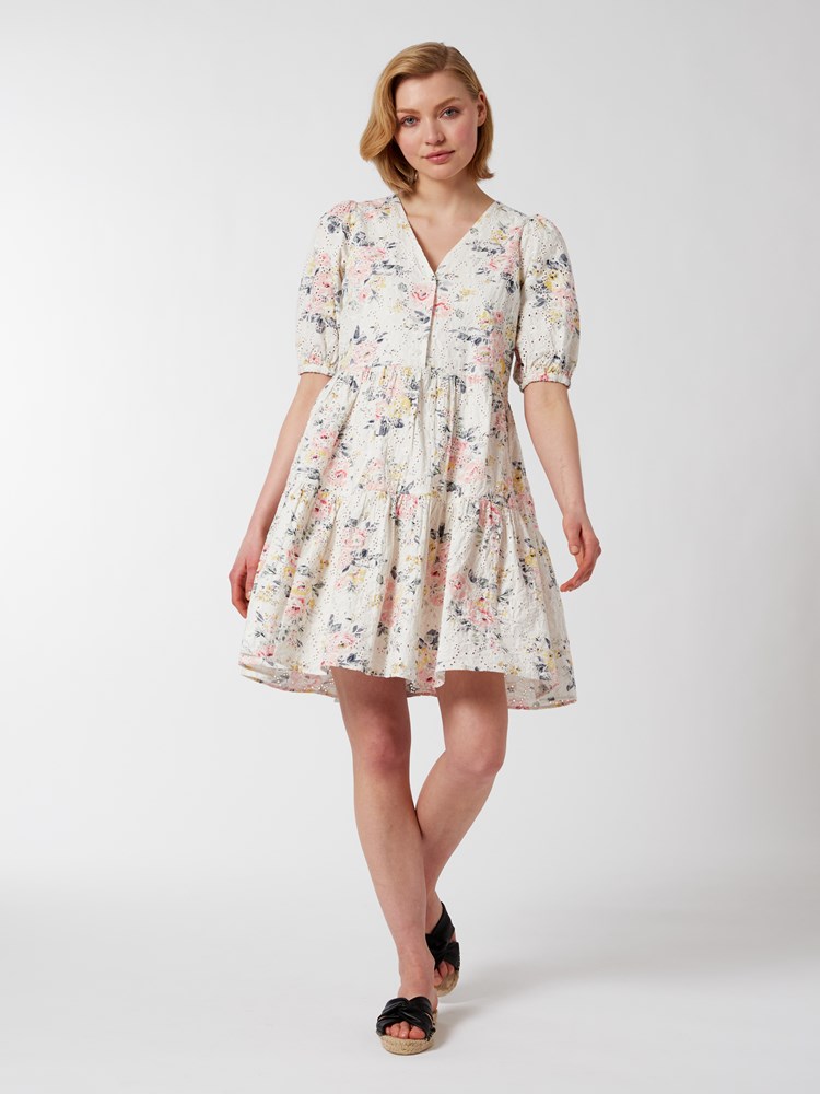 Sommerlig og feminin kjole i blomstermønstret engelsk blonde med fôr. Kjolen har v utringing og knapper til livet i front, liten pufferm med elastikk nederst og kappeskjørt med god vidde. Lengde ca til ovenfor kneet.