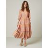 Vakker mønstret kappekjole i eksklusiv viskosekvalitet med godt fall og fôr i kroppen. Kjolen har v utringing med liten rysjekant, 3/4 lang pufferm med dobbel rysjekant og elastikk nederst, kappeskjørt med rik vidde, og elastikk i livet. Liten metallbadge nederst og lengde ca til leggen. Modellen er 173 cm høy og bruker str S.