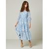 Vakker mønstret kappekjole i eksklusiv viskosekvalitet med godt fall og fôr i kroppen. Kjolen har v utringing med liten rysjekant, 3/4 lang pufferm med dobbel rysjekant og elastikk nederst, kappeskjørt med rik vidde, og elastikk i livet. Liten metallbadge nederst og lengde ca til leggen. Modellen er 173 cm høy og bruker str S.