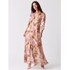 Lang kjole i behagelig viskose med delikat print og innvendig mykt fôr. Kjolen har skjult glidelås i siden, drapering på skulderen, liten puff, 3/4 lang erm, høyt skåret liv med små rynker under bysten, frontknapping med stofftrukne knapper og langt utskrådd skjørt med splitt