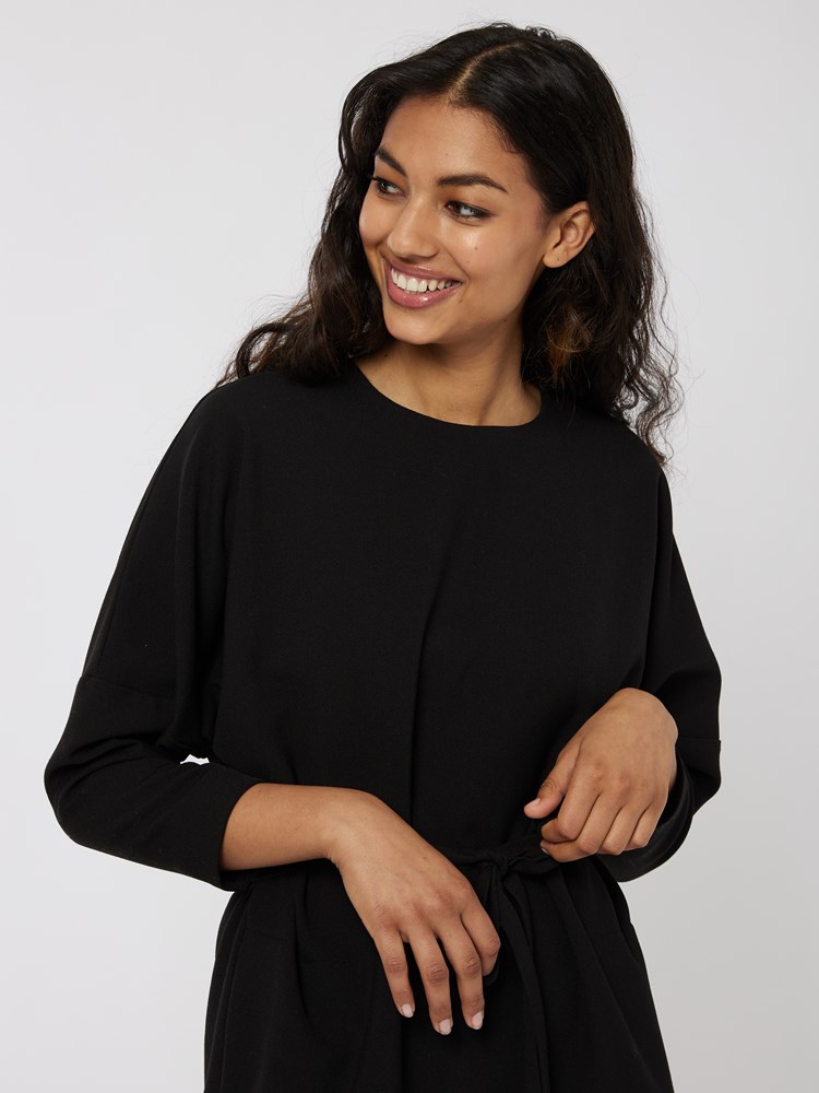 Renskåren kjole med 3/4 lang kimonoerm, rund hals og løst knytebelte i livet. Kjolen har gode lommer i siden, skjørt som smalner inn, og glidelås i ryggen. Lengde ca til under kneet. Grå variant er melert, og sort en ensfarget.